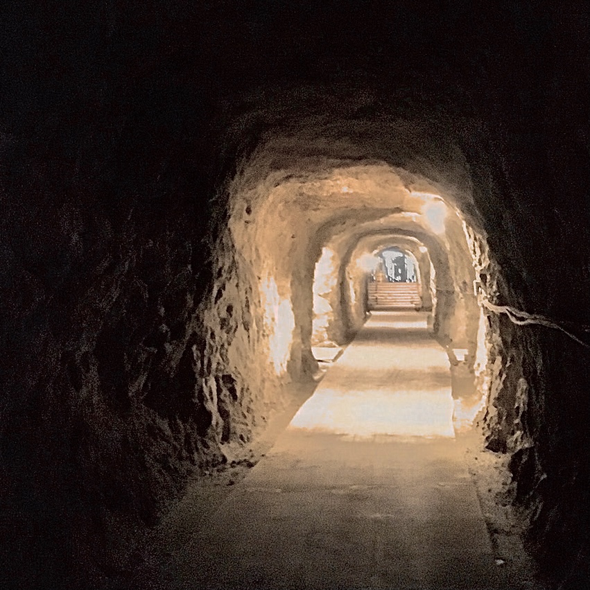びっくりしましたが、ひどいにおいはしなかったのと、なんだかほのあかるくかんじられたので、クルクルとねじれたそのかいだんをおりてみますと、なかにはいっぽんみちの地下どうが。なんと、でんきもともっています。