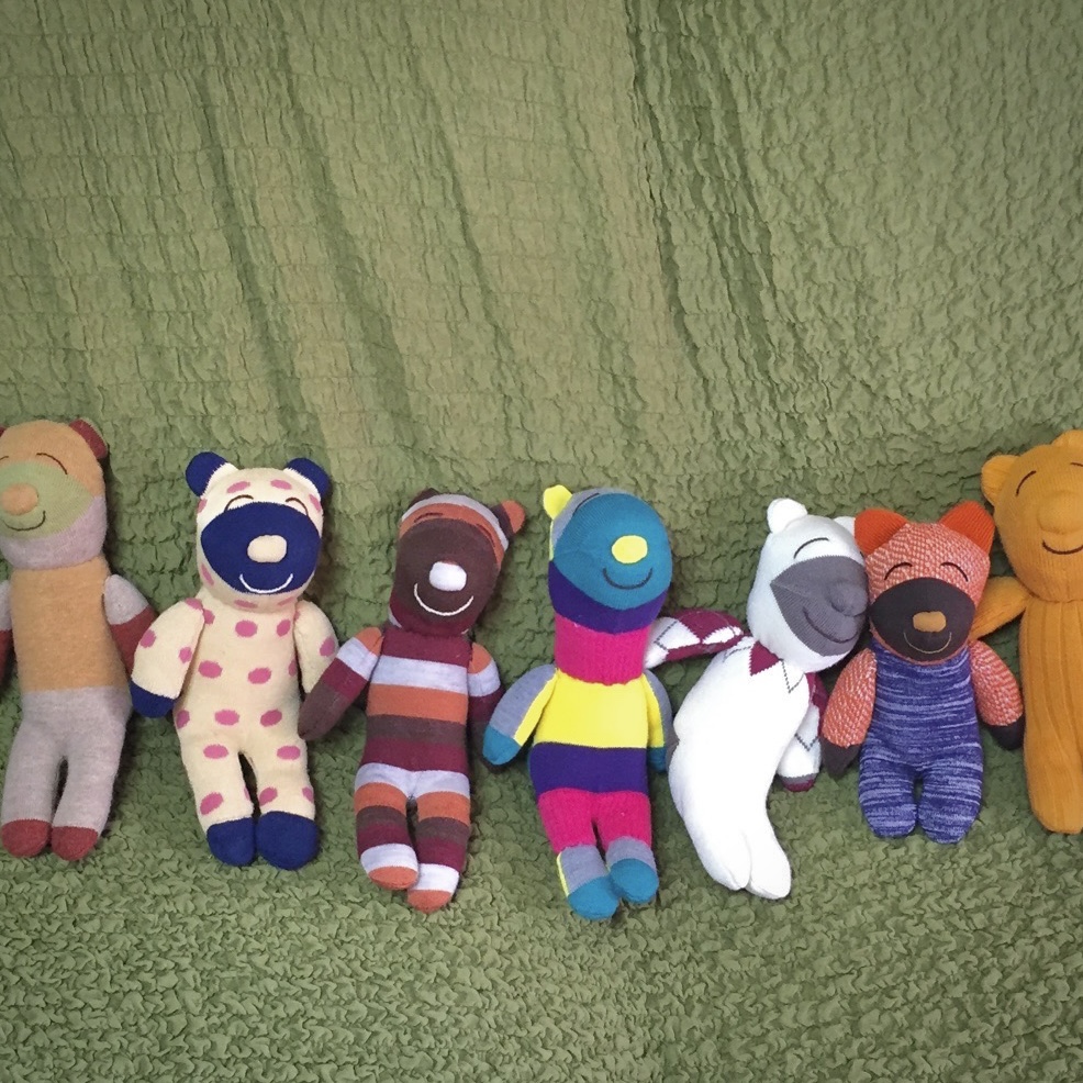 ぜんぶ、どこかのおうちのものほしから、かぜにのってとんできたくつしたなんですって。どれもかたほうしかないので、しかたなくぞうきんやつめものにつかうつもりだっていうじゃないですか。それじゃあもったいない、と、ゆずってもらいました。